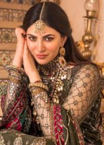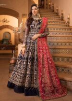 This ensemble features intricately embroidered net panels and bodice enhanced with richly detailed silk borders and ghera accents. It is paired with embroidered sleeves and a chiffon dupatta adorned with beautifully crafted pallus and contrasting silk borders, creating a vibrant and festive look.