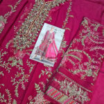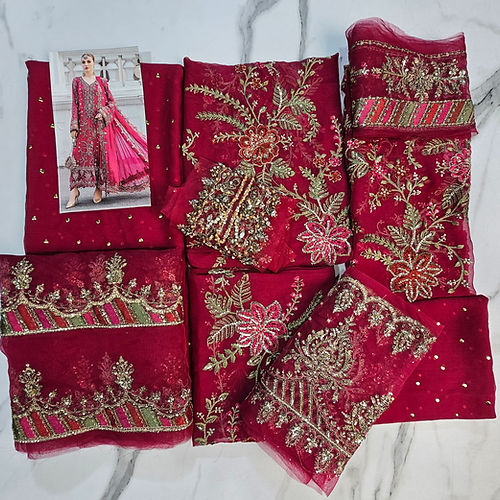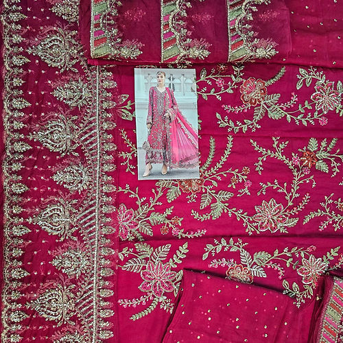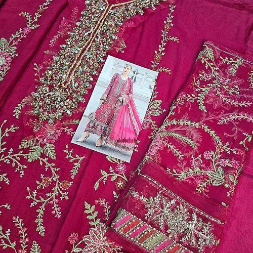 This bright pink chiffon ensemble features an intricately embroidered organza neck patch with hand embellishment, a detailed center panel, side kali, and organza daman and sleeve pattis. It includes a dyed chiffon back, embroidered sleeves, and a raw silk undershirt for a polished finish. The look is completed with a diamanté-adorned chiffon dupatta with organza patti and dyed raw silk trousers, blending elegance with vibrant charm.