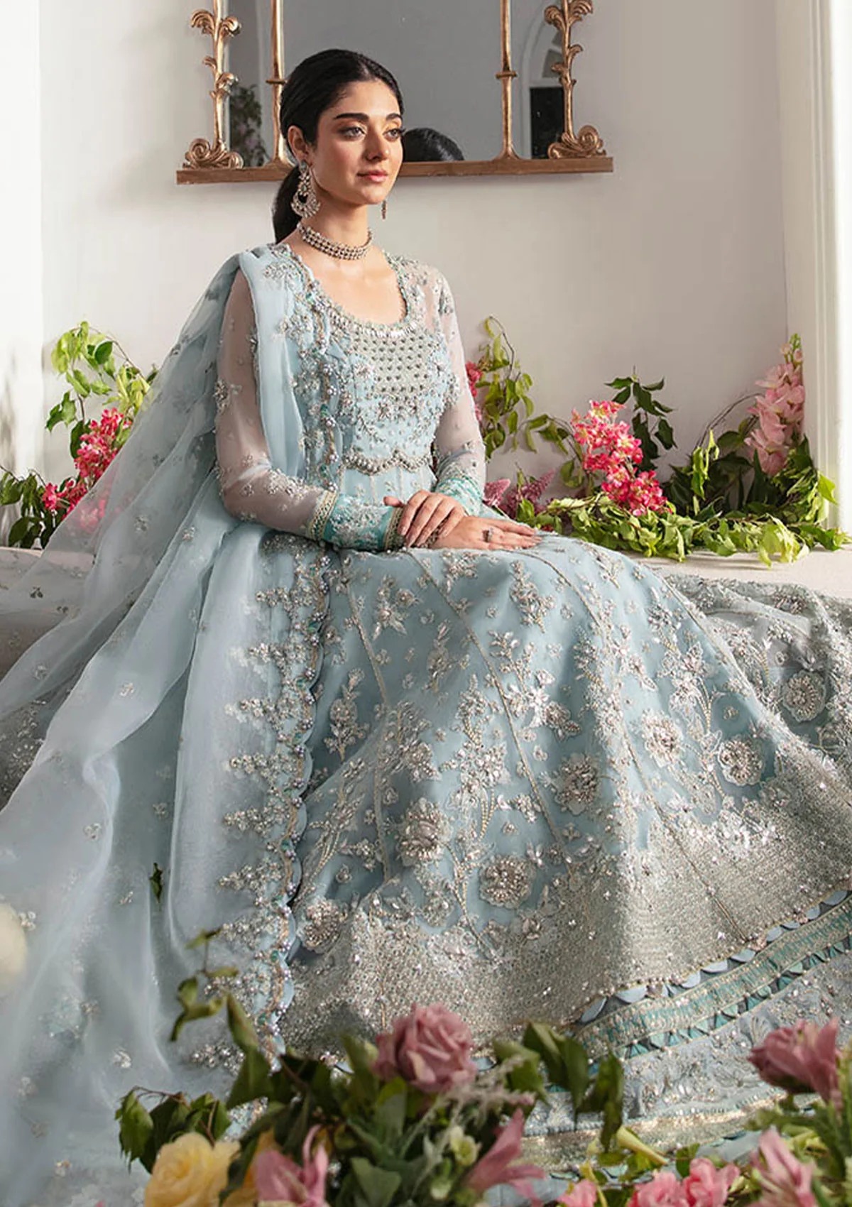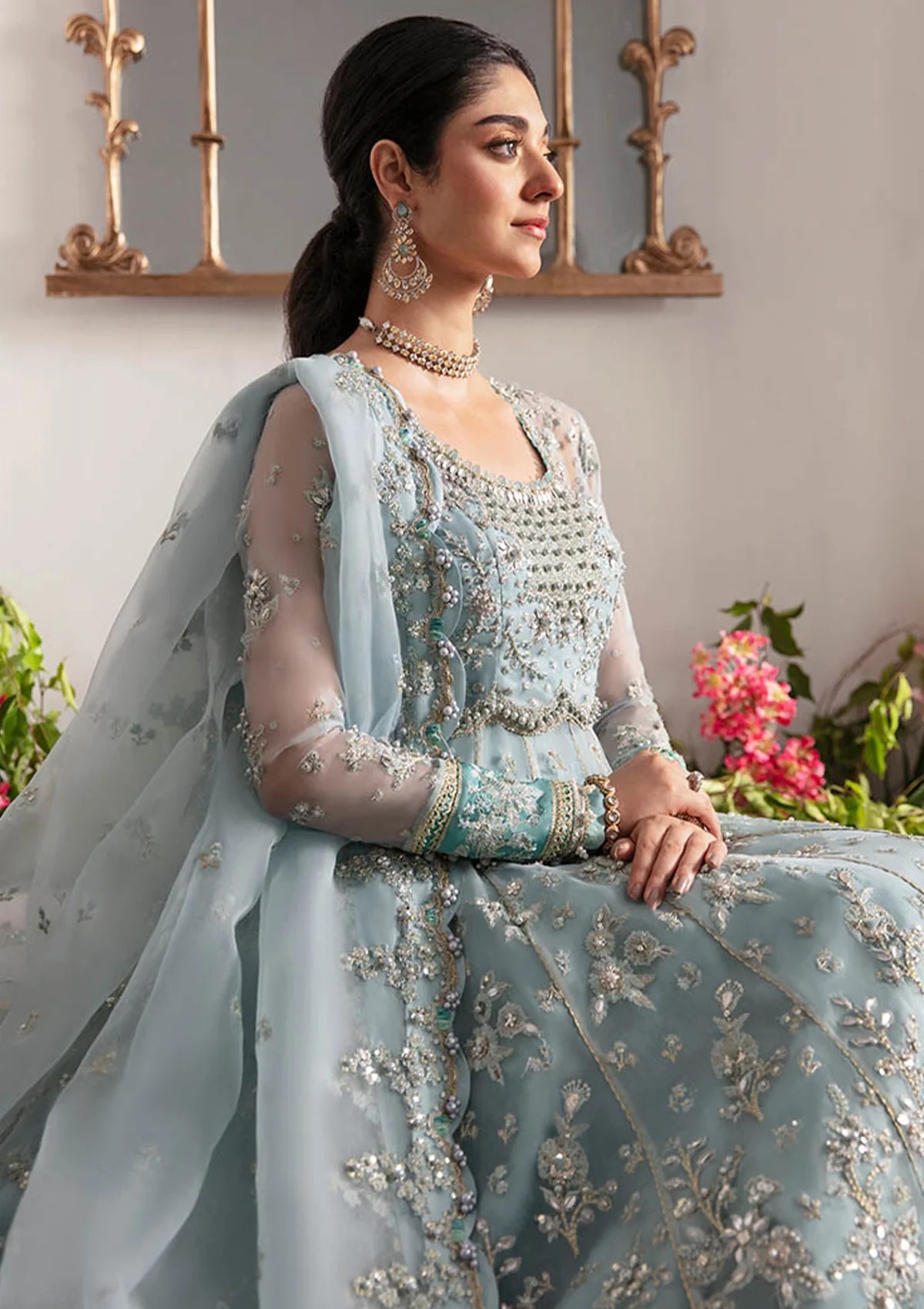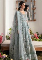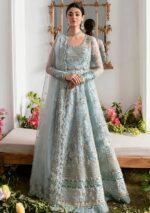 This ensemble features beautifully embellished and embroidered organza panels with detailed satin borders on the front, back, and sleeves. It is paired with a fully embroidered organza dupatta and completed with a dyed raw silk slip and trousers for an elegant, festive finish.