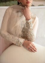 This ombre pink ensemble showcases pure raw silk adorned with intricate hand embellishments for an elegant, luminous look. Paired with matching raw silk culottes and a delicately accented organza dupatta, it reflects refined craftsmanship and timeless sophistication.