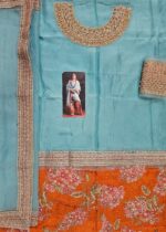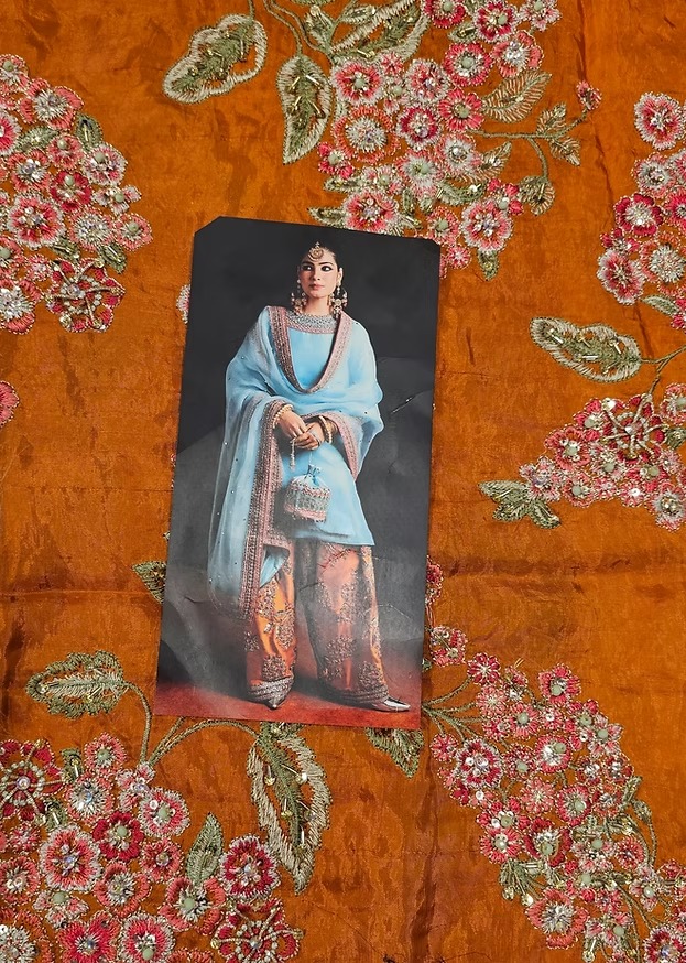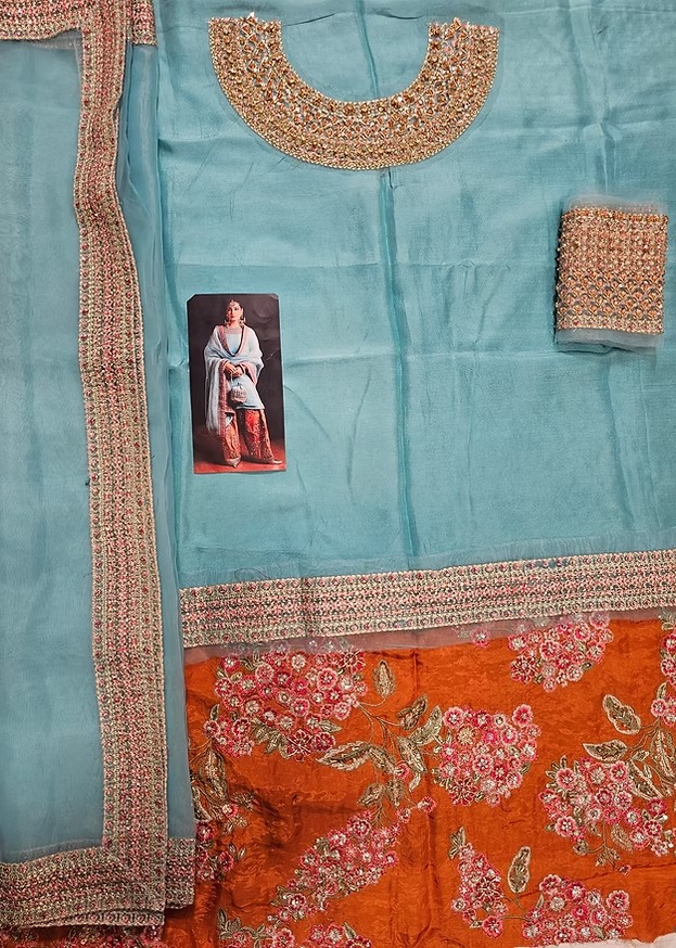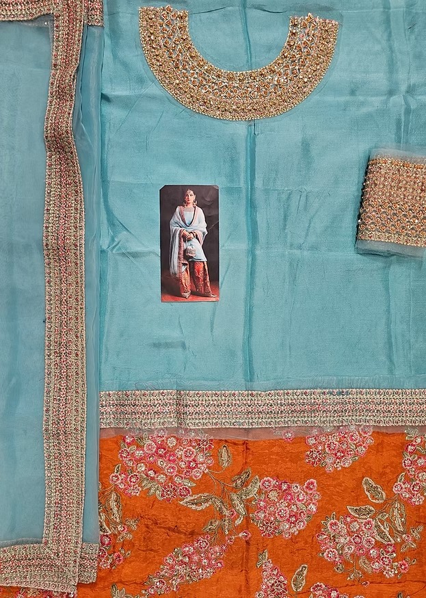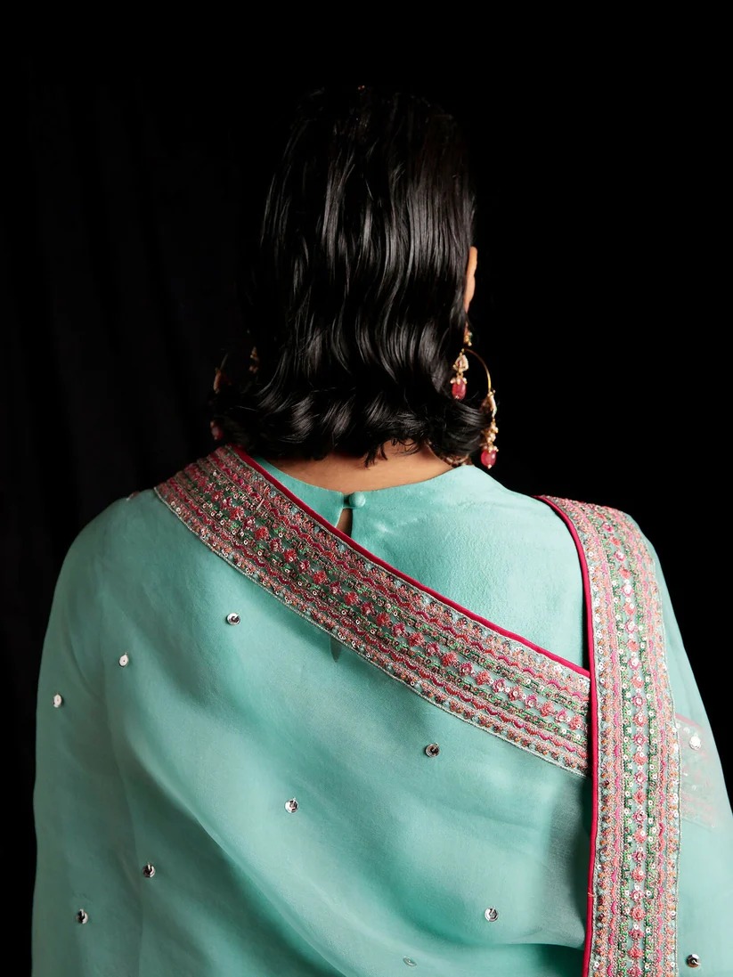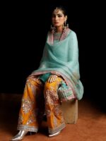 This ice blue ensemble features a raw silk shirt and shalwar paired with a flowing organza dupatta for a refined, graceful look. Designed to reflect quiet confidence and effortless sophistication, it’s perfect for those who value presence and understated elegance.