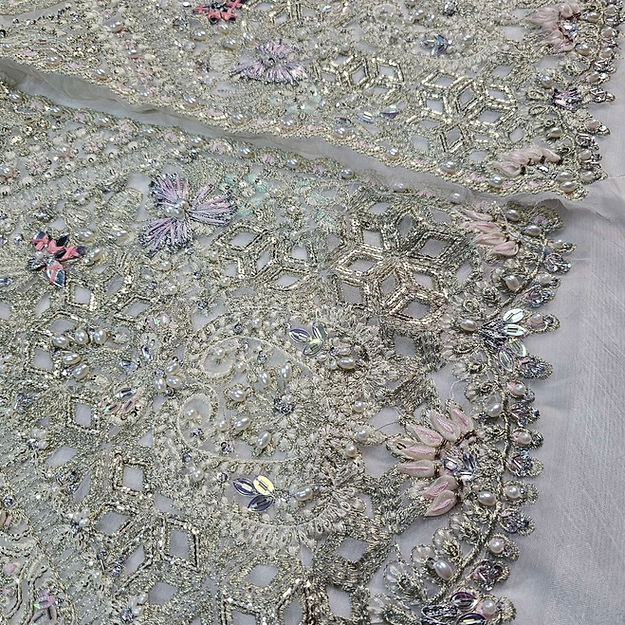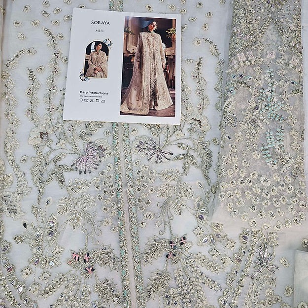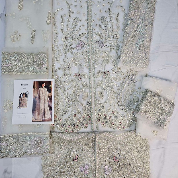 This ensemble features intricately embroidered and hand-embellished organza panels, borders, sleeves, and dupatta, finished with refined detailing throughout. It is paired with a dyed silk inner and a crushed silk sharara, creating an elegant and festive silhouette.