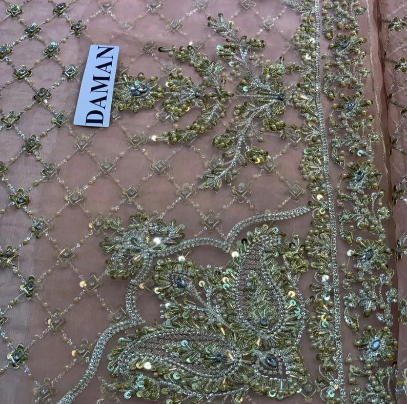 Inspired by Mughal architecture and blooming florals, this classic gharara set features intricate hand embroidery with pipal gira, gotta, dabka, naqshi, sequins, salma, and kinaari patti—perfect for traditional yet modern celebrations.