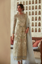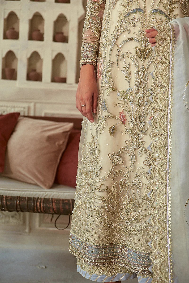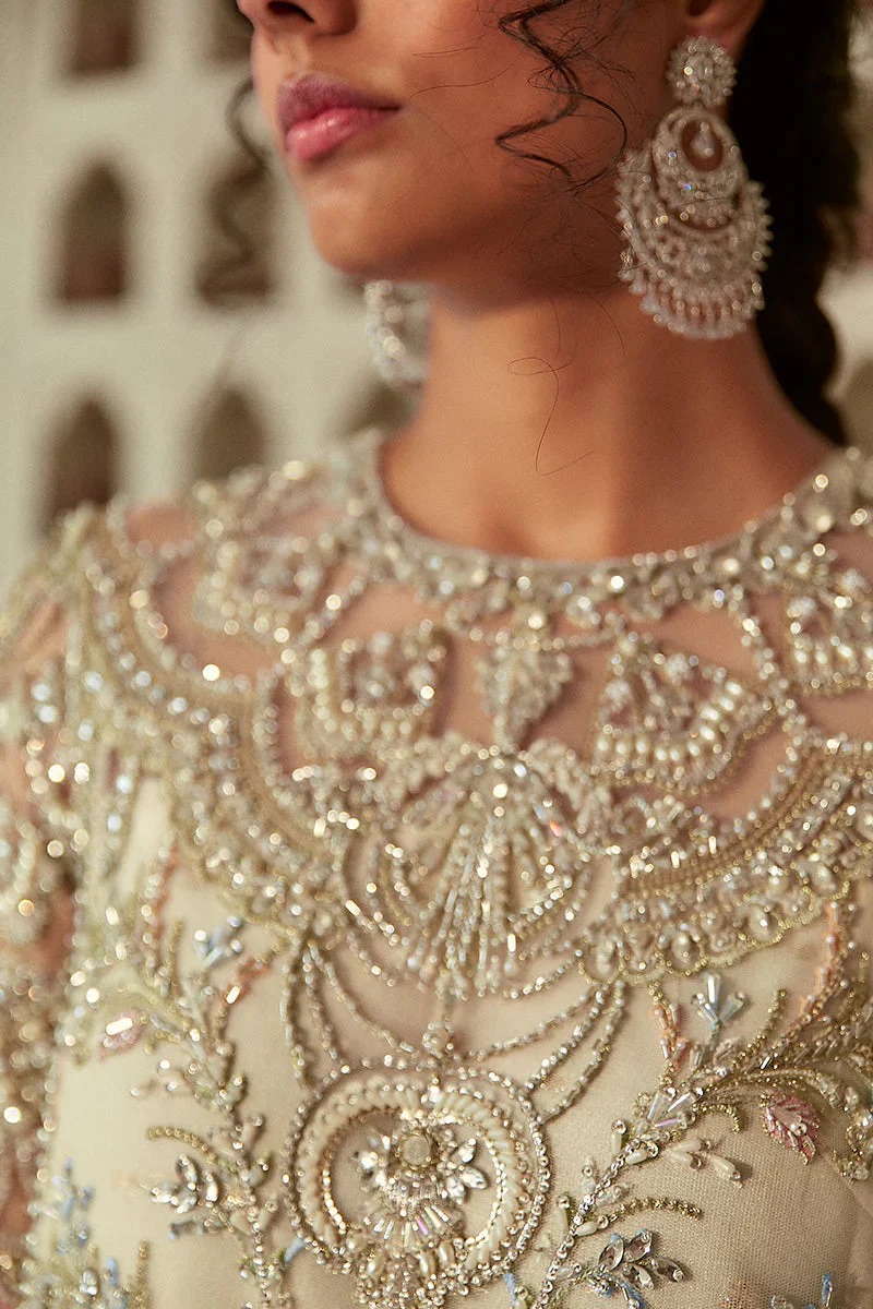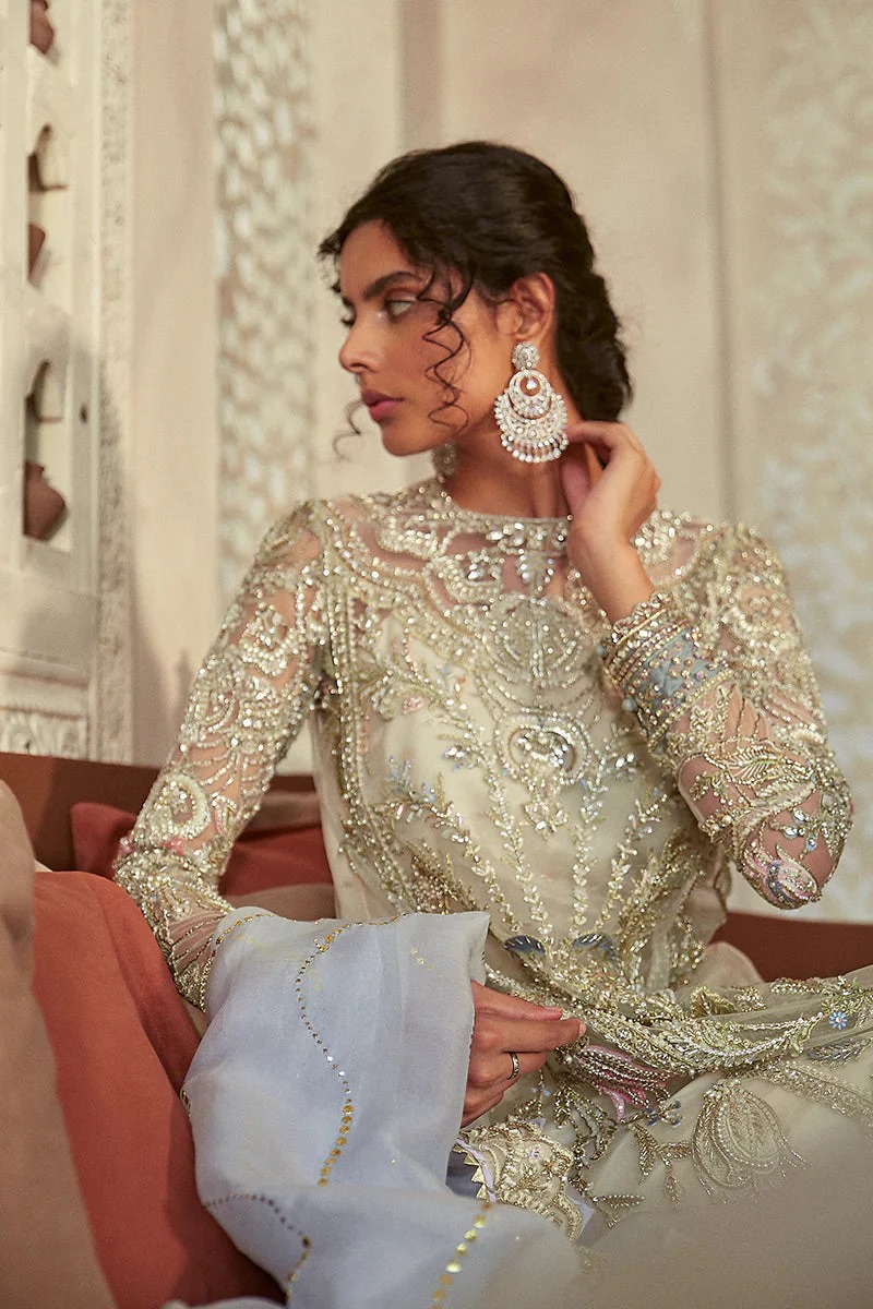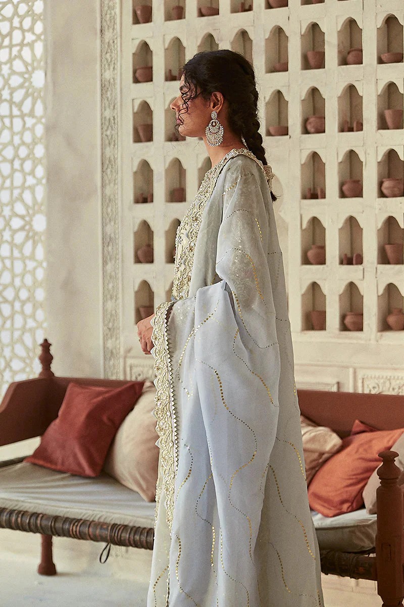 This ivory long shirt is adorned with pearl-encrusted hand embellishments for a graceful, luxurious look. Paired with an ice blue organza dupatta featuring worked borders and mukaish detailing, and ivory raw silk trousers finished with subtle gold embellishments.