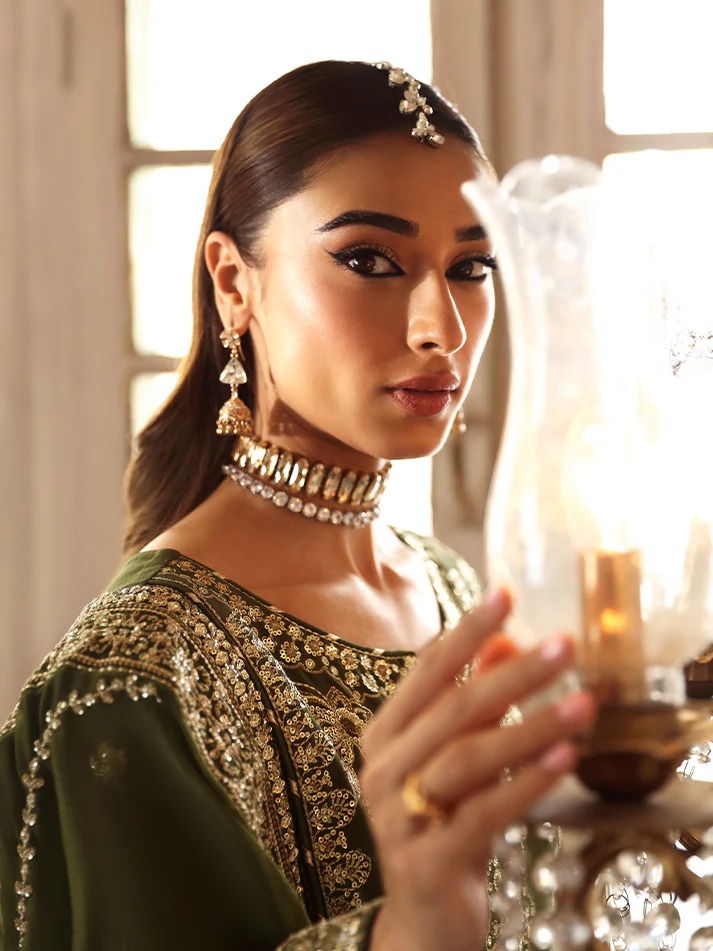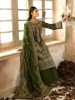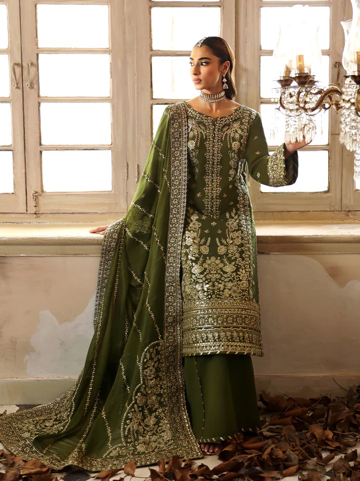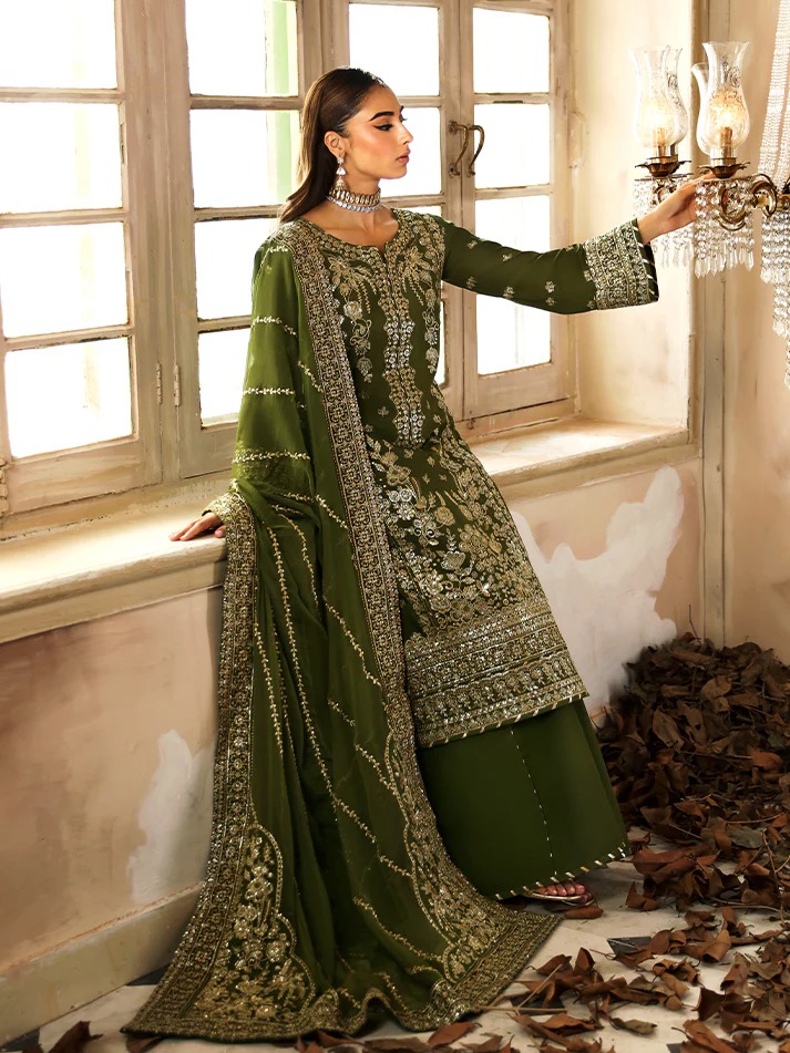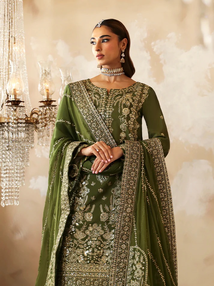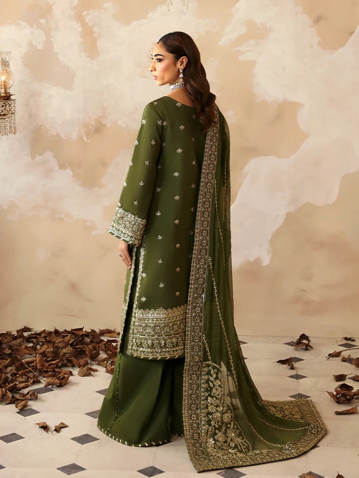 This ensemble features embroidered and sequined silk panels, sleeves, back, and detailed borders, showcasing refined craftsmanship throughout. Paired with a sequined chiffon dupatta enhanced with organza motifs and borders, and completed with dyed silk trousers for an elegant finish.